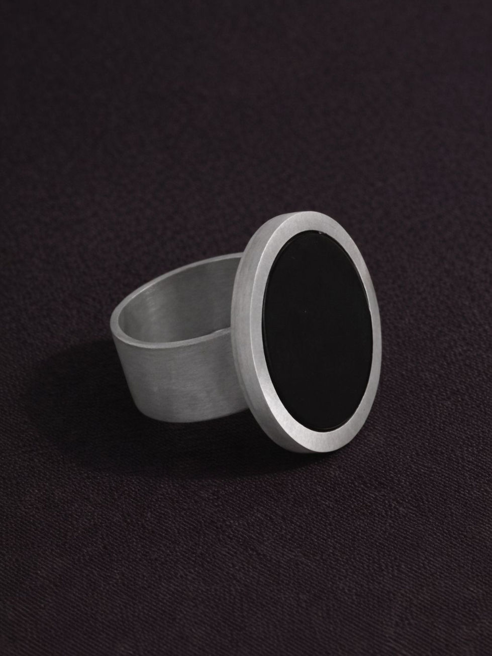 950 silver ring. With disc-shaped black agate stone. Brushed finish. Ring measuring 2.4cm. Weight 13g.