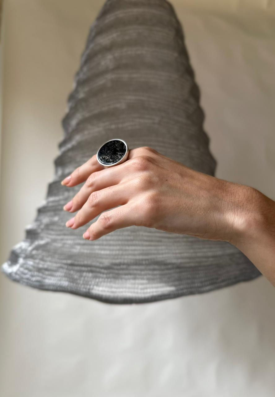 950 silver ring. Graphite quartz stone setting. Brushed finish. Ring measuring 2.7cm. Weight 18g.